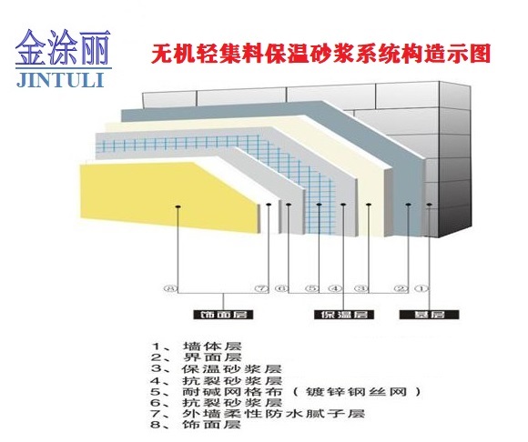 “金涂麗”無機(jī)輕集料保溫砂漿是一種新型保溫隔熱材料,是以?;⒅闉橹饕橇?、水泥、膠粉、硅粉、海泡石、植物纖維等配料經(jīng)無重力混合機(jī)混配而成,具有強(qiáng)度高、質(zhì)輕、保溫、隔熱好、電絕緣性能好、耐磨、耐腐蝕、防輻射等顯著特點耐高溫、耐老化、吸水率小等優(yōu)點。是做建筑內(nèi)外墻體保溫砂漿中的主要原料!本產(chǎn)品嚴(yán)格執(zhí)行公安部消防(2011)65號文件強(qiáng)指導(dǎo)生產(chǎn)。防火等級A1級。具有極好、優(yōu)異的墻體保溫隔熱防火效果。具有抗裂,其抗壓、粘結(jié)強(qiáng)度極高。本產(chǎn)品克服了聚苯顆粒等有機(jī)材料易燃、高溫時產(chǎn)生有害氣體、易老化。具有防火、保溫、隔熱性能、強(qiáng)度高、耐老化(可與建筑物同壽命)、操作方便等特點。