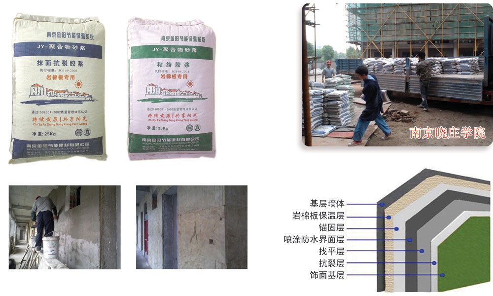 巖棉板專用砂漿是本公司針對巖棉板不易粘結,易開裂而精心研發(fā)的一種高強度粘結砂漿。添加了多種進口膠粉及抗裂成分使得抹面層的抗沖擊性大大提升。產(chǎn)品能永久粘結,不脫落,防滲,抗裂的特點。從而保證巖棉板保溫層外墻涂料的使用壽命。